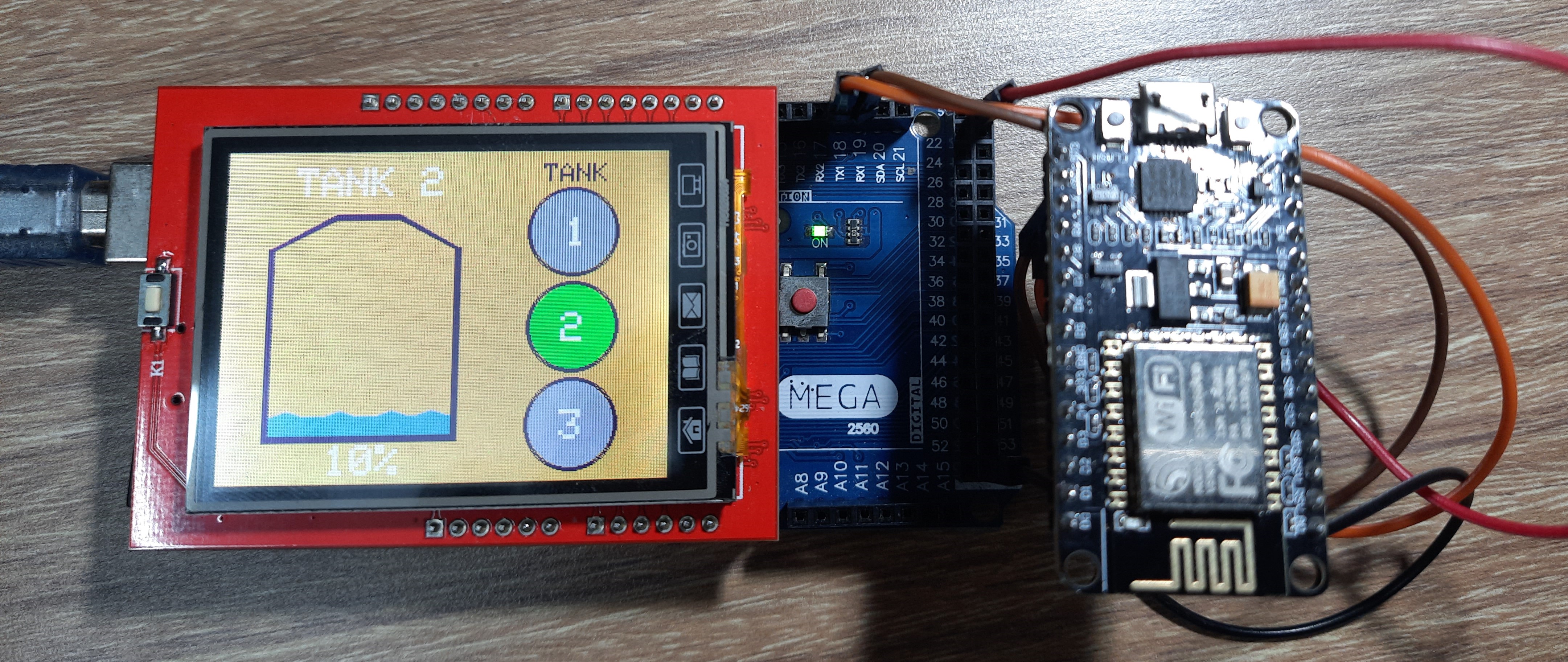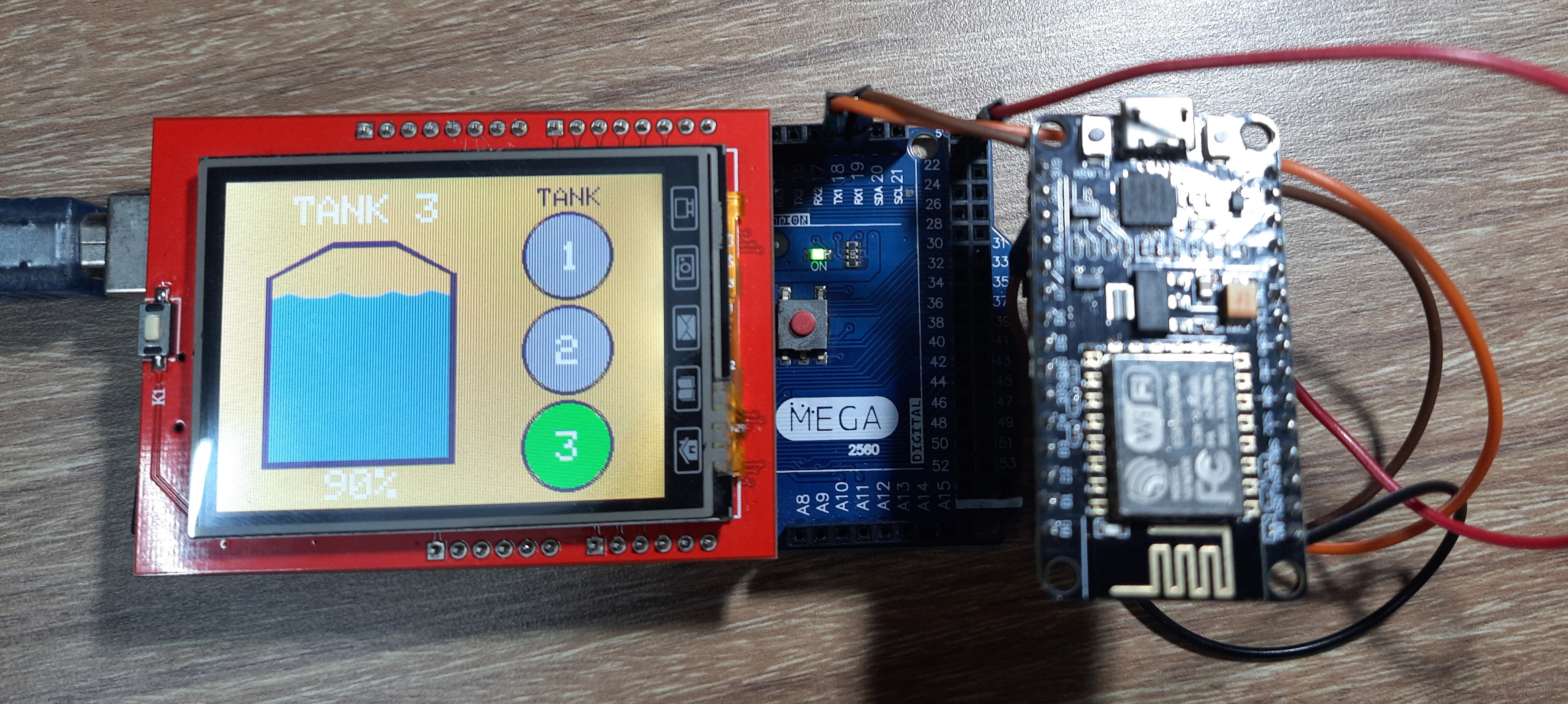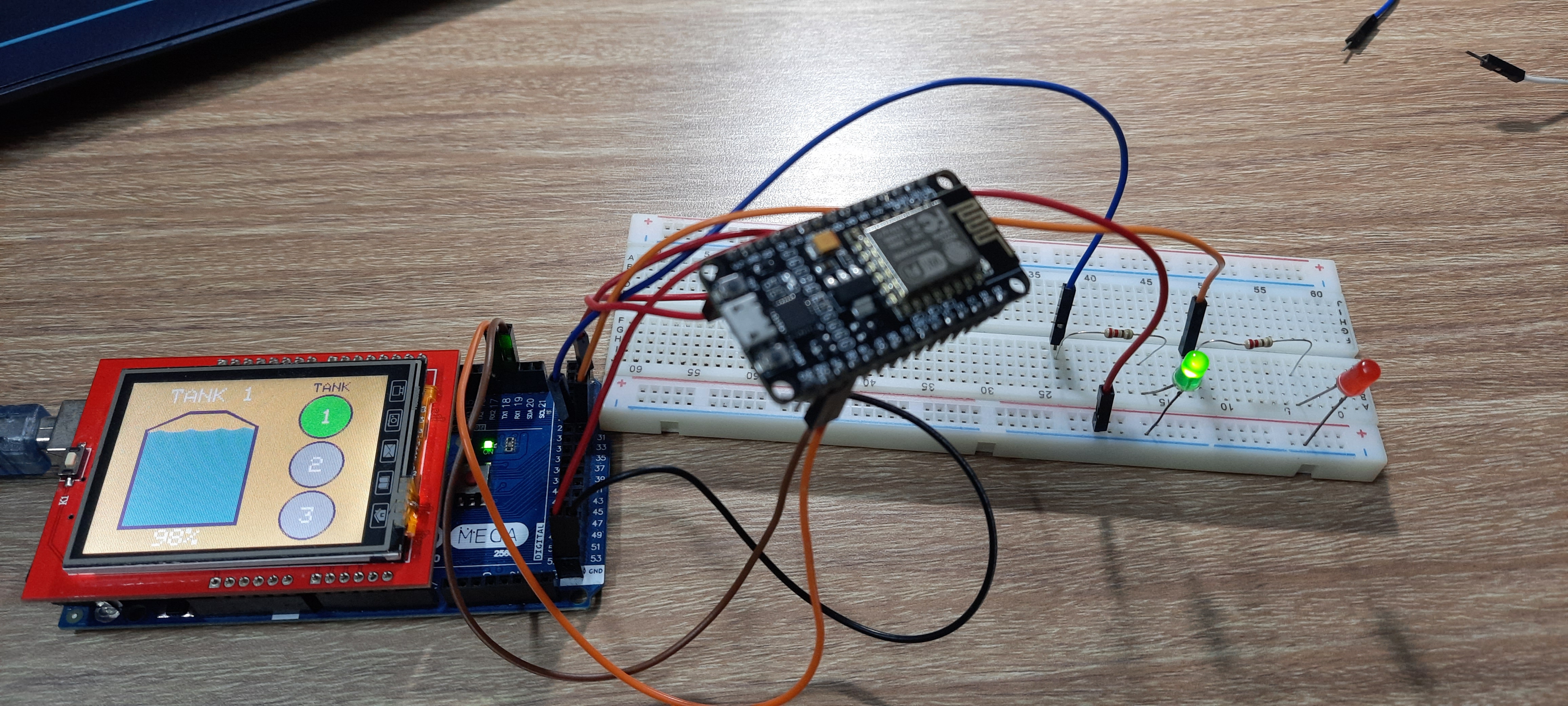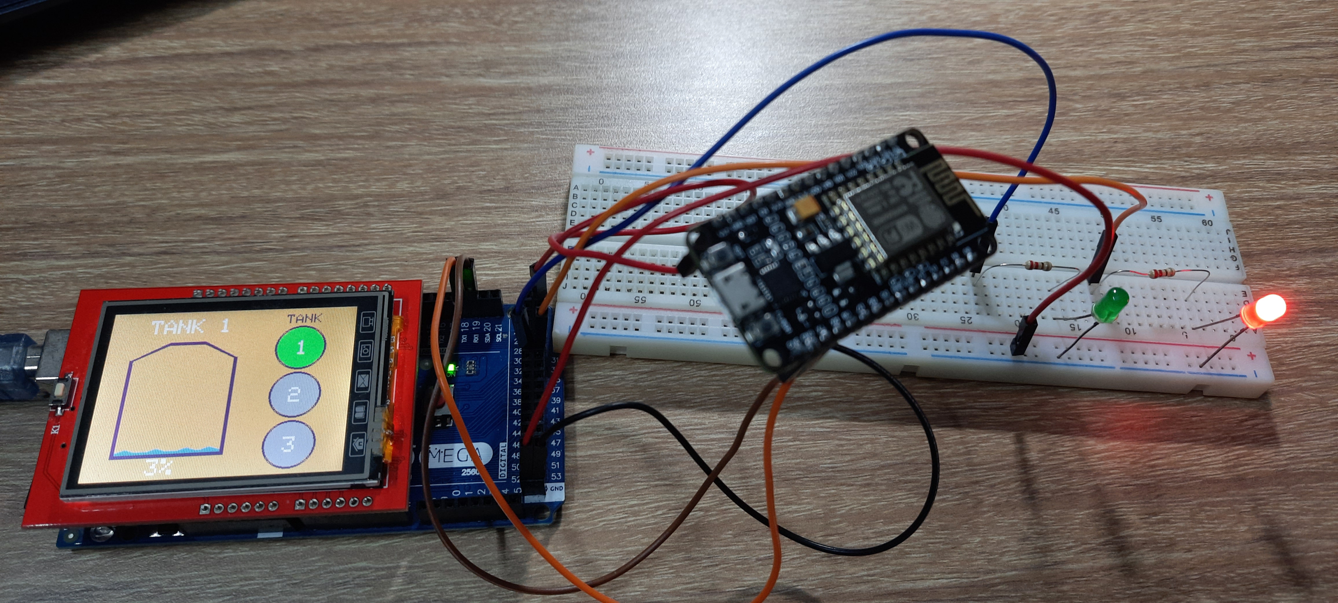 When the tank level rises above 97%, the green LED will turn on, and when the tank level goes below 6%, the red LED will turn on.