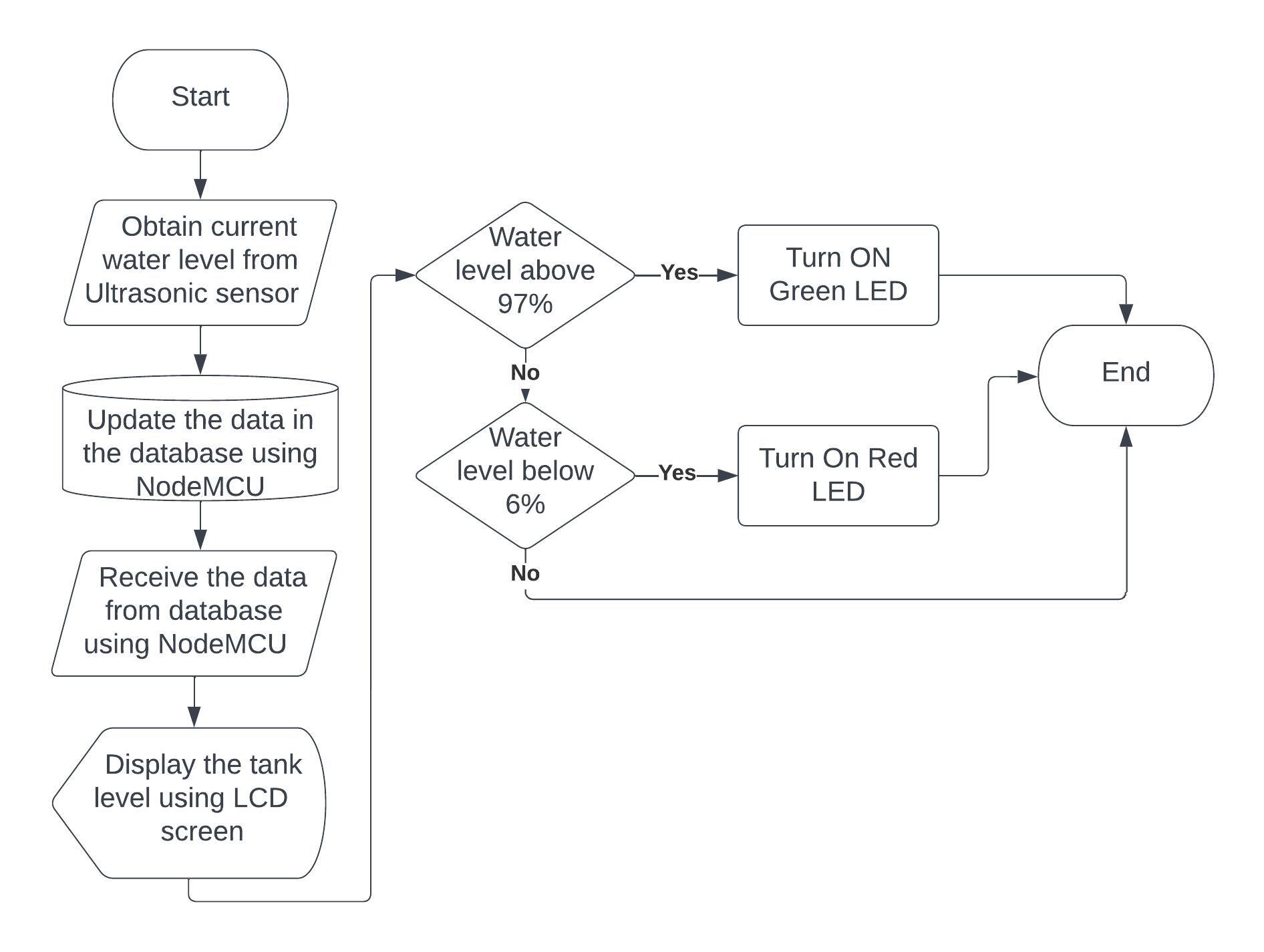 The overall process flow is shown in Figure 3. The water-resistant Ultrasonic sensor estimates the water level, and the data is updated using the NodeMCU on top of the tank in Google Firebase whenever the value changes. The NodeMCU in the user interface reads the updated value and displays it on the LCD screen. LEDs are used to indicate the high and low water levels in the tanks.